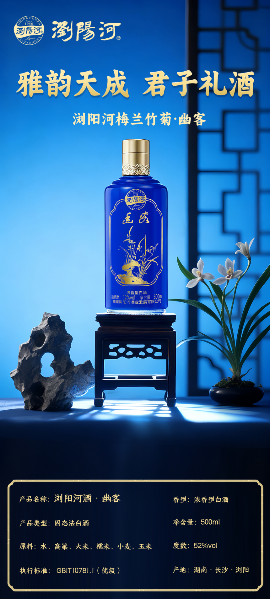 浏阳河梅兰竹菊系列之“幽客”浏阳河·梅兰竹菊系列白酒产自白酒历史悠久的大围山巅、浏阳河畔,酒精度为52%vol,净含量500ml。设计以经典瓶身结合“中国红、帝尊蓝、翡翠绿、帝王黄”等主色调传达传统东方审美,四色四瓶,各显风格,展现“优雅从容、坦然人生”的品牌调性。